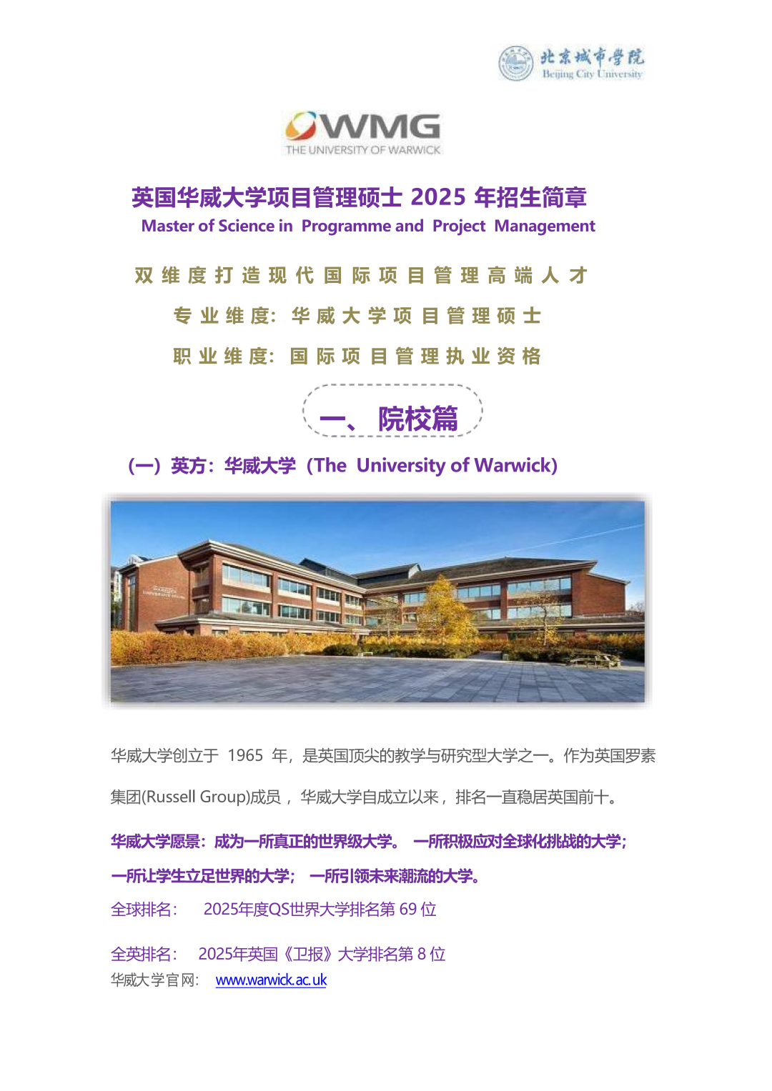 北京城市学院&英国华威大学-项目管理硕士